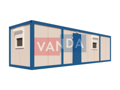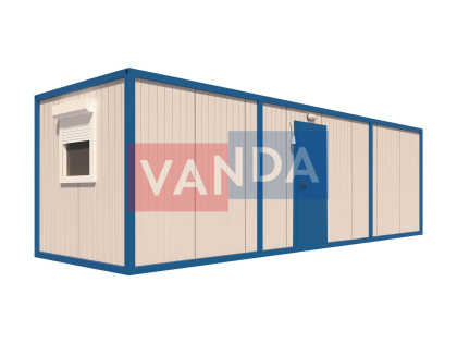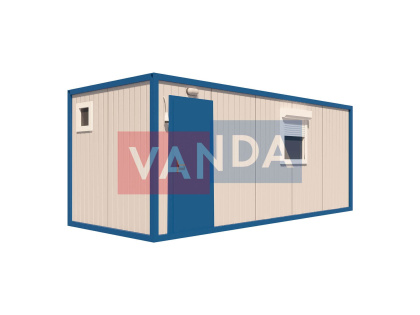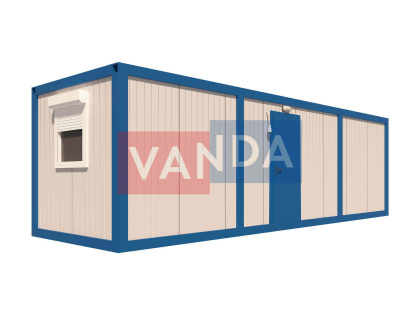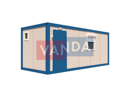 Данный контейнер не требует обустройства тяжеловесного фундамента, поскольку постройка легкая и устойчивая. Данный блок-контейнер может быть выполнен абсолютно любого размера и формы по эскизу заказчика.Контейнер состоит из металлического сварного основания. Стены изготовлены из сэндвич-панелей с прокладкой утеплителя. Крыша покрыта крашенным холоднокатаным металлом 1,2 мм. Помещение обустроено пароизоляцией при помощи технической пленки, которая проложена на полу и потолке. Внутренняя облицовка потолка выполнена из ПВХ-панелей, пол – из шпунтованной доски. Вход в помещение оборудован запирающейся металлической дверью.